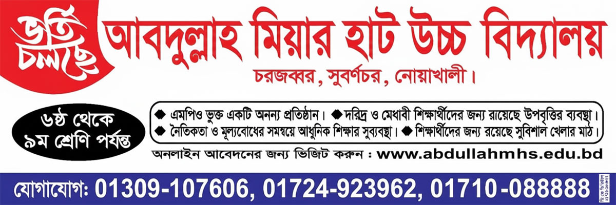 Abdullah Miar Hat High School​ -​ এর পক্ষ থেকে জানাই স্বাগতম ও শুভেচ্ছা। পৃথিবীর সাথে তাল মিলিয়ে দেশ যখন এগিয়ে যাচ্ছে আমরা কেন তাহলে অন্যদের চেয়ে পিছিয়ে থাকবো ?  আপনারা জেনে আনন্দিত হবেন যে, বাংলা একাডেমী কর্তৃক নির্ধারিত শুদ্ধ উচ্চারণের অঙ্গীকার নিয়ে আমরা সৃজনশীল শিক্ষা দানের উদ্দেশ্যে  যুগোপযোগী ও আধুনিক স্কুল প্রতিষ্ঠার লক্ষ্যে একটি যুগান্তকারী উদ্যোগ গ্রহণ করেছি।